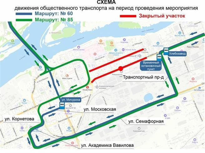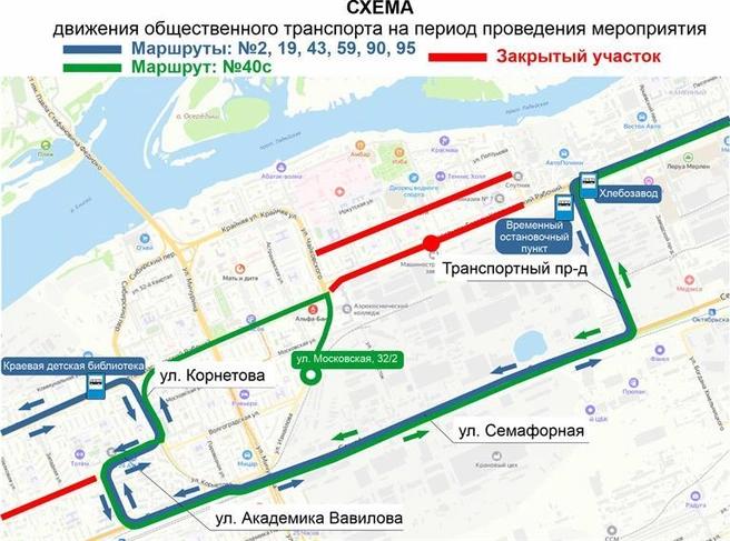 Изменения коснутся и автобусов. Маршруты №2, №19, №43, №59, №90, №95 и №40С поедут в объезд через улицы Семафорную, Вавилова и Корнетова. Другие автобусы, включая №3, №8, №10, №60 и №85, направят через Транспортный проезд и улицу Мичурина.