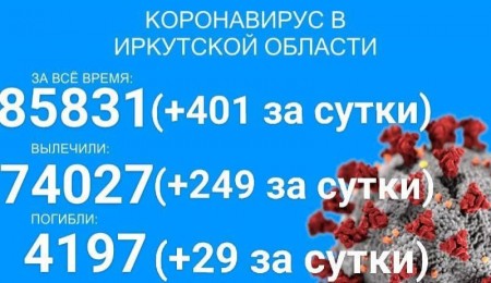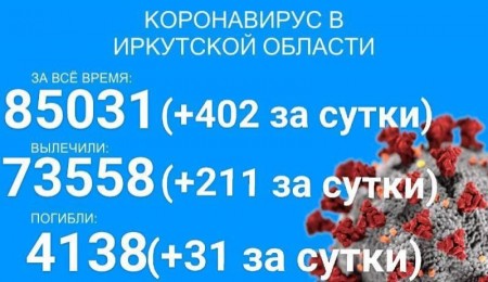 По данным оперштаба Иркутской области на 29 июля, на территории региона зарегистрирован 85031 официально подтверждённый случай заболевания COVID-19. Суточный прирост составил 402 новых случая. В больницах лечится 5238 человек.