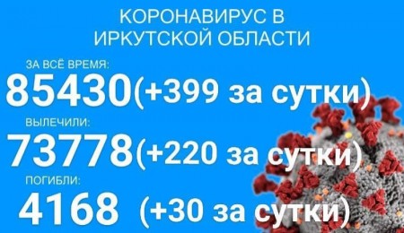 По данным оперштаба Иркутской области на 30 июля, в регионе зарегистрировано 85430 официально подтверждённых случаев заболевания коронавирусом. За сутки выявили ещё 399 новых случаев, в том числе девять вахтовиков и 43 ребёнка.