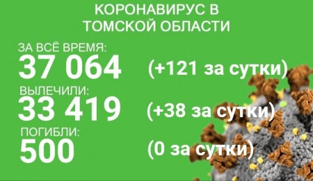 За сутки с 29 по 30 июля в Томской области коронавирус зарегистрирован у 121 человека. За время эпидемии в регионе заразились уже 37 064 человека. В минувшие сутки выздоровели 38 пациентов. Всего излечились 33 419 человек. В регионе от COVID-19 и его осложнений погибли 500 человек.