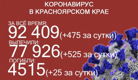 3 августа в Красноярском крае выявили ещё 475 заболевших коронавирусом. За всё время пандемии COVID-19 выявили у 92 409 жителей края. Выздоровело 77 926 человек, в том числе 525 за последние сутки. Количество погибших достигло 4515, скончалось ещё 25 заражённых COVID-19.