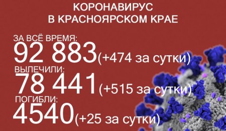 По данным на 4 августа, в Красноярском крае 92 883 случая заражения коронавирусом. Выявили ещё 474 больных, темп прироста – 0,5%. За всё время выздоровел 78 441 человек, в том числе 515 за последние сутки. Количество погибших достигло 4540, скончалось ещё 25 заражённых COVID-19.