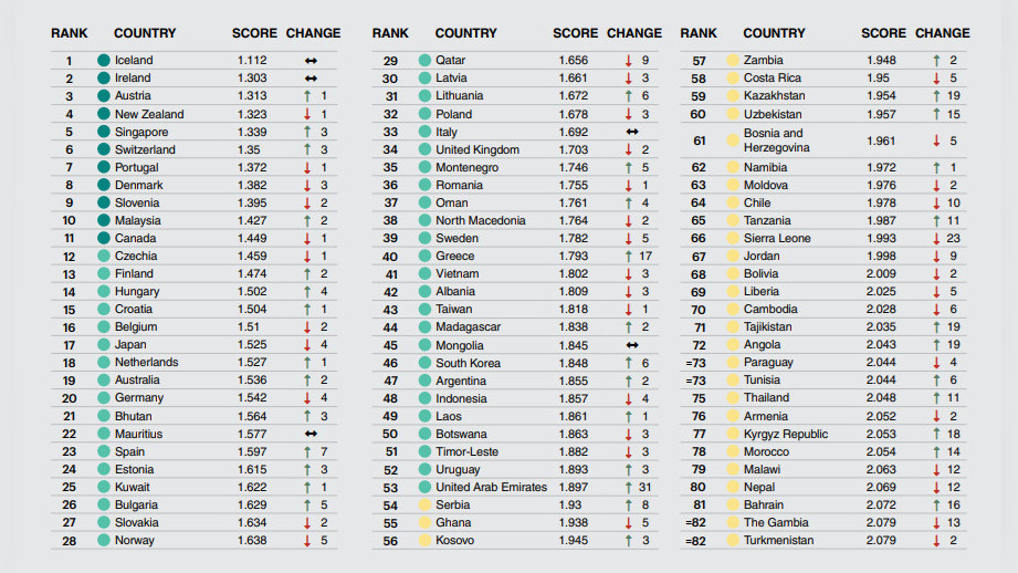 На противоположном полюсе списка находятся государства с высоким уровнем насилия и нестабильности, такие как Йемен, Судан и Афганистан. Также, по понятным причинам, в числе аутсайдеров рейтинга находятся Россия и Украина.