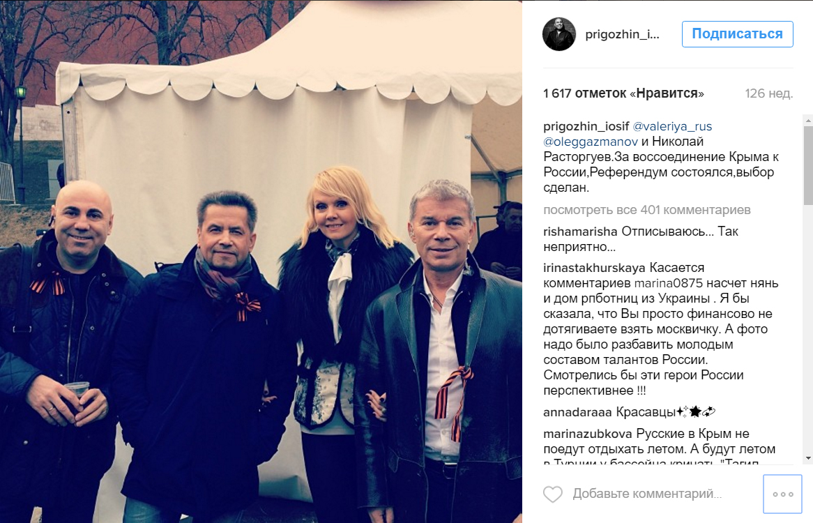 Переворот в сознании Пригожина налицо. В марте 2014 года он одним из первых поддержал итоги референдума, опубликовав в Instagram фотографию с женой, Николаем Расторгуевым и Олегом Газмановым и подписью