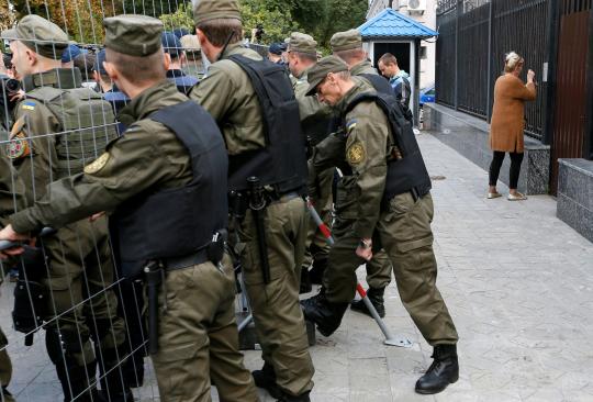 Украинская полиция охраняет посольство России, где проходят выборы нижней палаты парламента РФ. Фото с места событий.