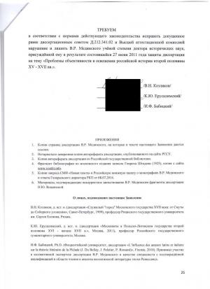 Ещё 25 апреля 2016 года в Министерство образования и науки РФ было подано заявление, с требованием лишить Мединского учёной степени доктора исторических наук, подписанное известными историками.