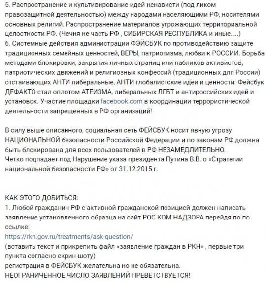 Многочисленные группы и сообщества ЛГБТ, всевозможных антироссийских правозащитных организаций и сект в ФЕЙСБУКЕ ведется целенаправленно, для ухода от российского законодательства и ради продолжения противозаконной, антироссийской и анти нравственной ПОДРЫВНОЙ деятельности», - заявил активист.
