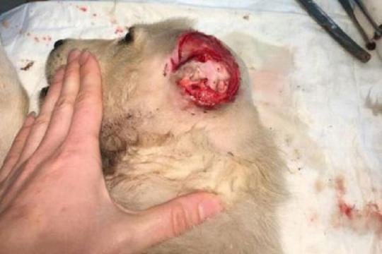 Она тут же повезла его в ветеринарную клинику. Врач сказал, что травма очень серьёзная, непонятно, как малыш не умер от боли. Ветеринару пришлось стянуть с головы щенка кожу, чтобы прикрыть оставшиеся оголенными хрящи, и отрезать хвост. В противном случае раны бы загноились и жидкость могла попасть в позвоночник и в голову.
