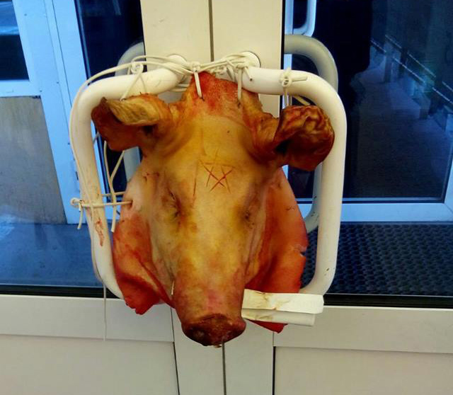 31 октября к дверям офиса Дмитрия Толмачева принесли свиную голову с вырезанной на ней пятиконечной звездой. Рядом лежала листовка с надписью "Предложение пока в силе. Соглашайся!"