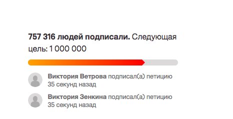 На сайте Change.org петиция с требованием не повышать пенсионный возраст стремительно движется к одному миллиону голосов. Петиция под названием «Президенту РФ, Правительству, Федеральному Собранию: Не повышать пенсионный возраст!» была создана общероссийским объединением профсоюзов «Конфедерация труда России». Размещенная 14 июня, к вечеру 16 июня она набрала более 750 тысяч подписей.