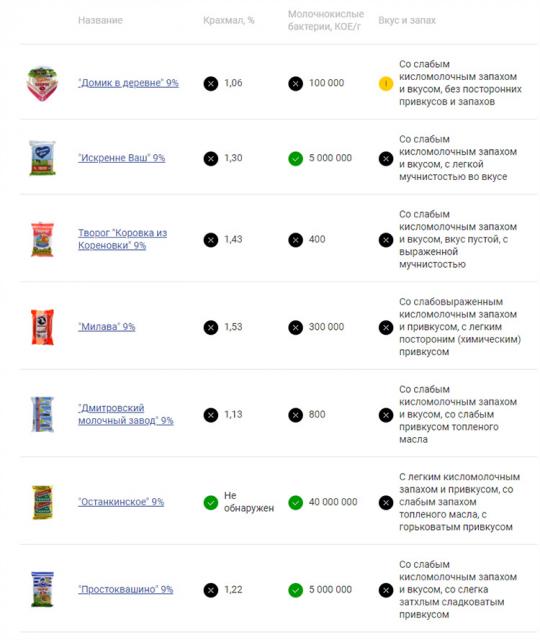 Все образцы, кроме «Останкинского», попались на содержании в них крахмала, который не является молочным компонентом и добавляется исключительно для придания густоты, а также с целью замаскировать некачественное сырьё. Как следствие – во всех этих творогах повышенное содержание углеводов. Кроме того, в четырёх образцах – «Домик в деревне», «Дмитровский молочный завод», «Коровка из Кореновки» и «Милава» – катастрофически низкое содержание молочнокислых бактерий – от 400 до 300 000 при норме не менее 1 000 000 на грамм продукта.