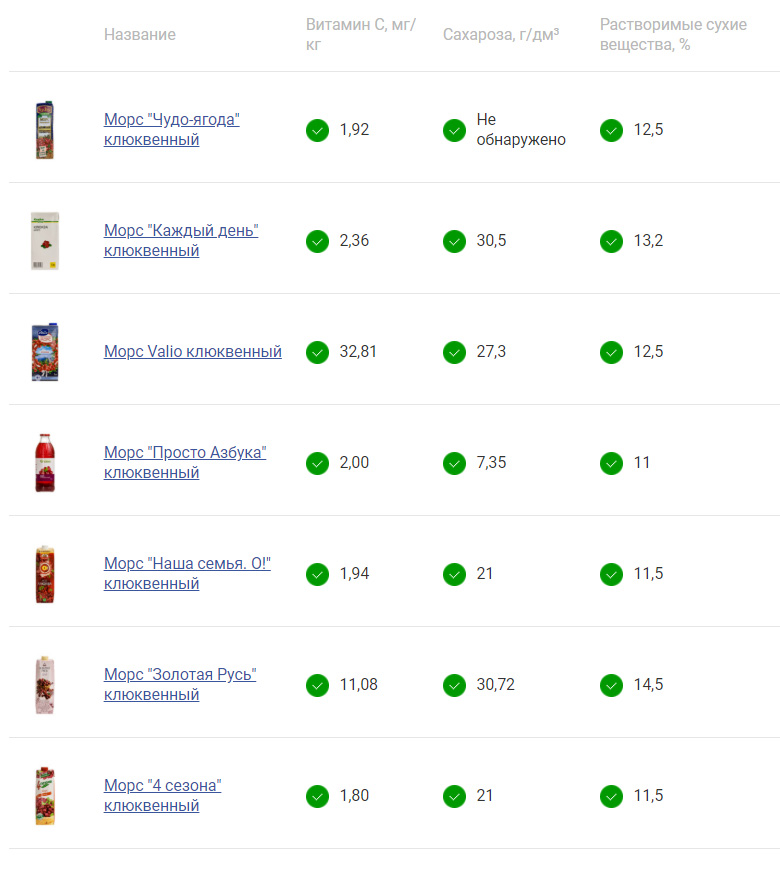 В лабораториях организации проверили на качество и безопасность клюквенные морсы семи популярных в России марок: «4 сезона», «Золотая Русь», «Каждый день», «Наша семья. О!», «Просто Азбука», «Чудо-ягода» и Valio. В результате ни один из образцов не только не попал в Чёрный список, но даже не получил серьёзных замечаний.
