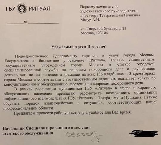 В адрес директора Московского драматического театра имени А. С. Пушкина Артёма Мазура пришло официальное письмо за подписью начальника Специализированного отделения агентского обслуживания столичного городского похоронного бюро «Ритуал».
