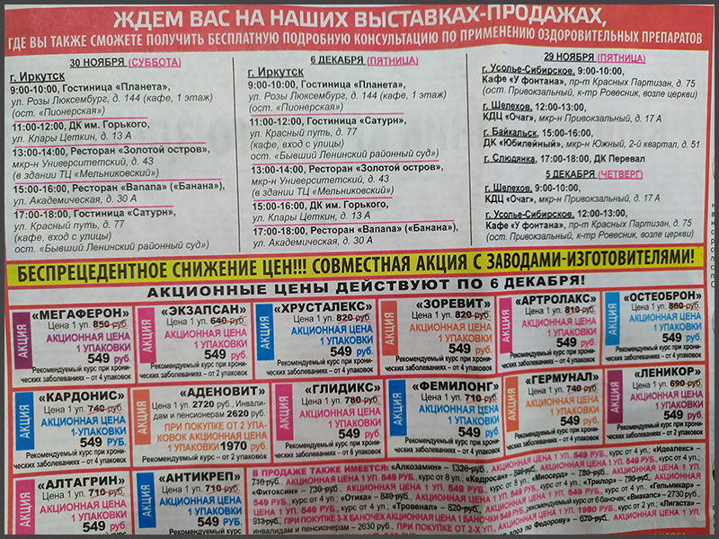 - Ну, что здесь рассказывать: газета в общем сама про себя рассказывает, современный человек сразу поймет, что это – какой-то обман, газета нацелена исключительно на стариков - она есть в каждом почтовом ящике, в любом заборе частного дома, по всей необъятной. Правда никакой юридической информации об организации в газете не указано. Газета изобилует предложениями вылечить пожилым людям любые болезни, в ней рассказываются убедительные «истории потребителей» предлагаемой продукции. Если взять газету – на первой странице всегда будут отзывы, будто бы от стариков, такого рода, что будто бы начались проблемы со здоровьем, а после курса приема того или иного БАДа, все прошло и теперь есть и силы и здоровье. Все отзывы примерно об этом. Все это пишется группой профессионалов именно в такой стилистике, которую люди старой формации привыкли воспринимать еще в советское время, тем самым, как мне кажется, в значительной степени воздействуя на степень доверия пенсионеров, которые толпами потом скупают предлагаемую продукцию. Был даже случай, когда в офис позвонил человек с такой претензией, мол, вижу в вашей газете отзыв от моей бабушки, она умерла много лет назад и никак не могла его оставить. Происходит это по всей России. Головной офис находится в г. Москве. Наши близлежащие регионы – Иркутскую область, Бурятию и Забайкалье курирует офис, который находится в г. Красноярске.