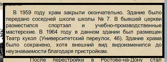 Напомним, история борьбы ростовской епархии за здание кукольного театра началась задолго до принятия 327‑го закона. Первая попытка поповской братии «отжать» помещение в центре города была предпринята в далёком 2000 году. На том основании, что театр построен на фундаменте разрушенной греческой (!) церкви. После 16 лет бесплодной борьбы в епархии решили поменять формулировку, и фундамент превратился в церковь с пристройками. Вот два скриншота с сайта Ростовской‑на‑Дону епархии, сделанные ИД «Крестьянин», что называется, «до» и «после»:
