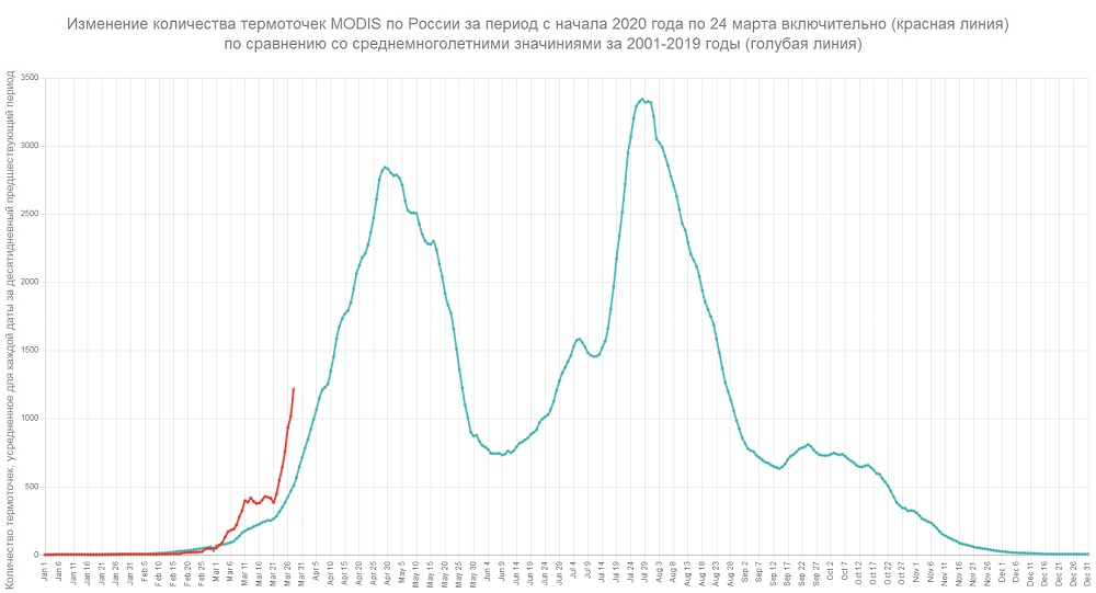 Руководитель лесного отдела «Гринпис России» Алексей Ярошенко считает, что погодные условия 2020 года в большинстве густонаселенных районов Средней полосы и Северо-Запада Европейской России (малоснежная и теплая зима, ранняя и сухая весна) предопределяют возможность развития катастрофических лесных и торфяных пожаров, аналогичных пожарам 2010 года. Ярошенко приводит данные, согласно которым на протяжении марта количество термоточек (температурных аномалий земной поверхности, фиксируемых специальными спутниками, обычно соответствующих интенсивным пожарам) примерно вдвое превышает среднемноголетние значения.
