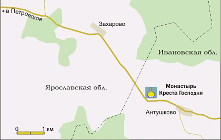 Монастырь Животворящего Креста Господня находится неподалёку от деревни Антушково в живописнейшем месте, добраться до которого весной и осенью невозможно