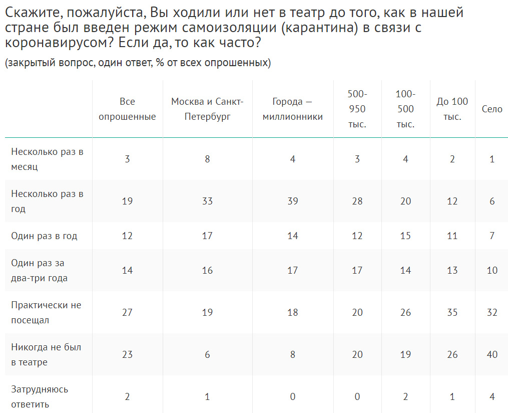 Как выяснилось в ходе опроса 1600 россиян в возрасте от 18 лет, лишь 3 % из них (в Москве и Санкт‑Петербурге 8 %) до введения режима самоизоляции посещали театр несколько раз в месяц. От одного до нескольких раз в год заглядывает в театры каждый третий житель страны. Ещё 14 % культурно отдыхают раз в два‑три года.
