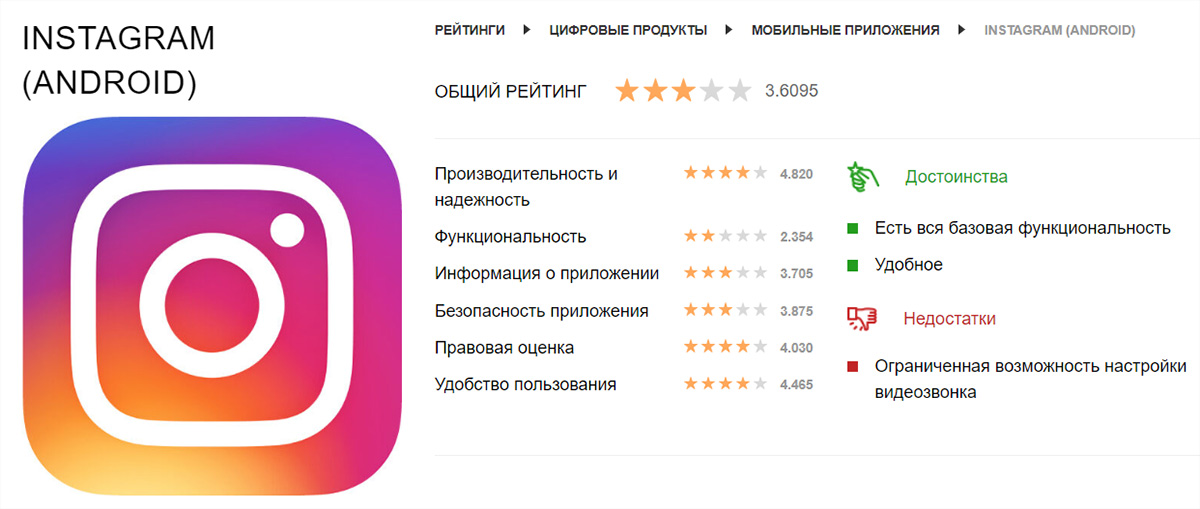 Результаты проверки приложения Instagram. Последнее место по безопасности, правовой оценке и в общем рейтинге