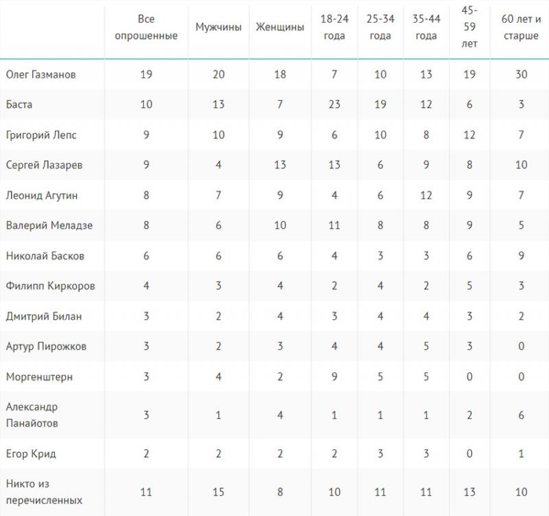 Обращает на себя внимание скромное девятое место хоть уже и не поющей, но всё ещё «примадонны» Пугачёвой (4 %) и совсем уж неожиданное предпоследнее место Лободы, которую назвали лучшей певицей всего 3 % россиян.