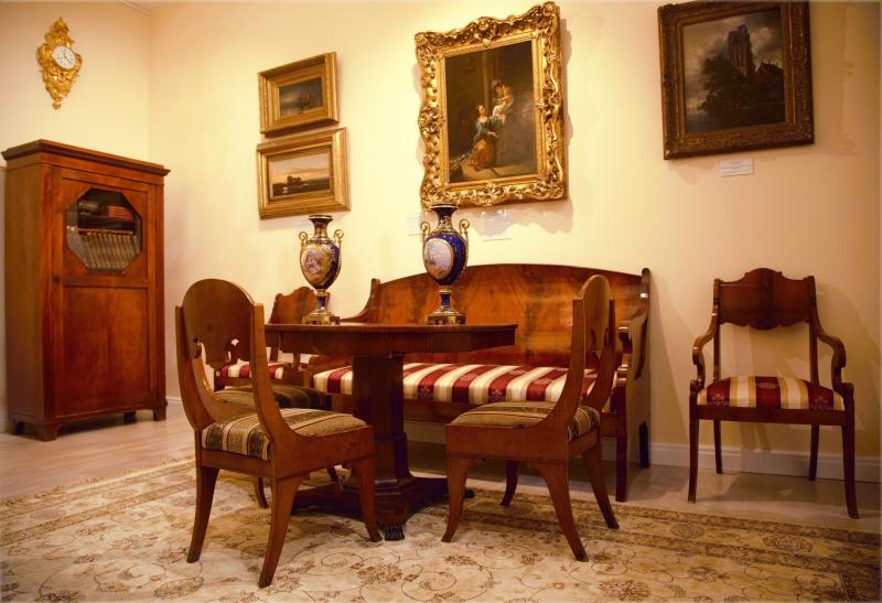 Один из залов оформлен в виде дворянской гостиной. Диван, несколько кресел вокруг столика. В углу стоит шкаф с книгами. Над ним висят часы. По стенам развешано несколько картин. Все подлинное, того времени, удачно воссоздает атмосферу давно ушедшей эпохи. Нечто подобное я ощущал в усадьбах заповедника в Пушкинских горах.