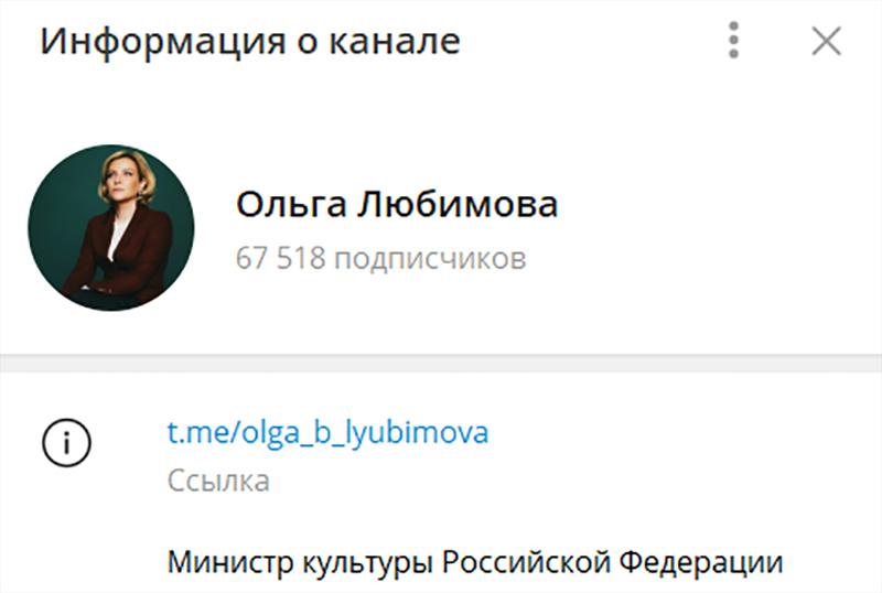 Занятные вещи происходят с министром культуры Российской Федерации Ольгой Любимовой. Вернее, с её телеграм-каналом и с каналом её ведомства. Видимо, сказывается грядущая смена правительства, в составе которого место Ольге Борисовне отнюдь не гарантировано. Вот и на церемонии премии «Золотой орёл» приветственное письмо президента зачитывала не она, а её предшественник Мединский.