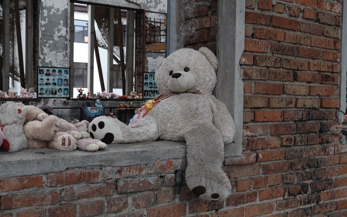 Находиться внутри спортзала, вернее, того, что от него осталось, тяжело. В глаза бросаются сотни имён и портретов погибших, расстрелянные и обгоревшие стены и много, много детских игрушек…