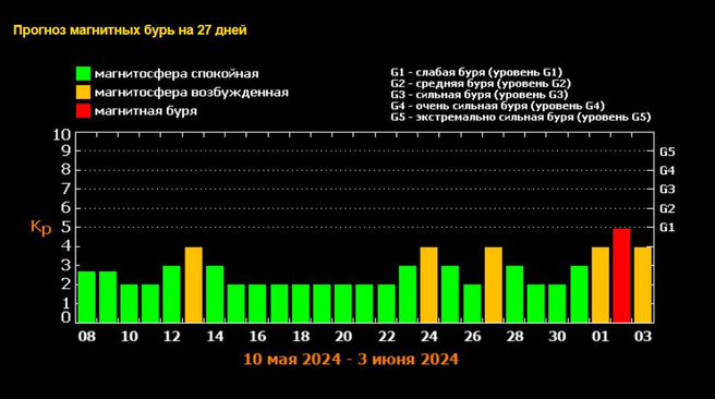 Возбужденная магнитосфера в столице Сибири ожидается 13, 24 и 27 мая. Уровень бури оценивается как слабый.