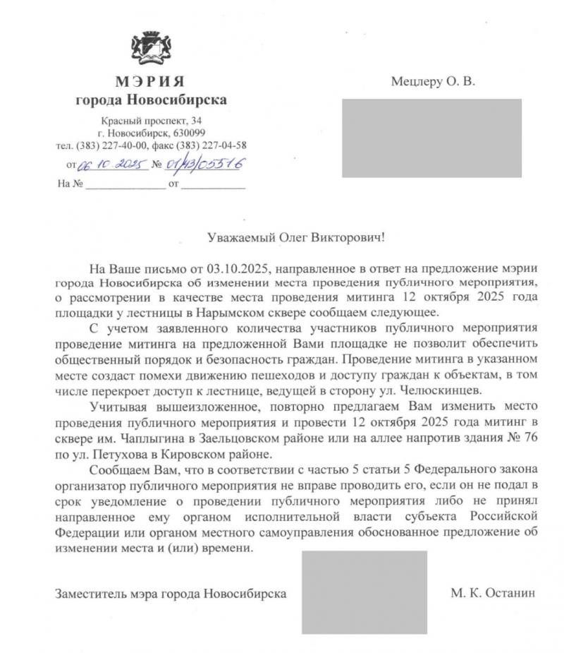 Параллельно с этим любые попытки публичного возмущения жёстко пресекаются. Показательна история активиста Олега Мецлера. Он пытался согласовать на 11 октября 2025 года пикет на 30 человек против роста НДС и утильсбора на площади Пименова, возле Государственной публичной научно-технической библиотеки (ГПНТБ). Мэрия Новосибирска во главе с единороссом Максимом Кудрявцевым отказала под надуманным предлогом «регламентных работ на фонарном столбе». Протестующим настойчиво предложили отправиться на городские окраины — в сквер Чаплыгина или на Затулинку. Подальше от глаз, чтобы не портили благостную картину.