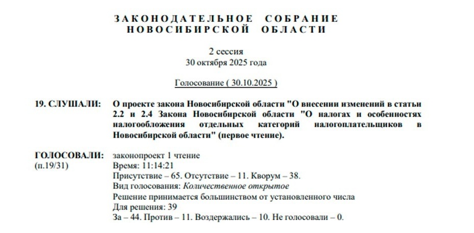 Речь идёт о тех самых пунктах, которые губернатор Андрей Травников продавил через Заксобрание 30 октября 2025 года. В первом чтении депутаты одобрили рост налога для машин до 100 лошадиных сил с 11 до 12 рублей за каждую «лошадь». Для самой массовой категории от 100 до 150 лошадиных сил ставка должна была вырасти с 16,5 рубля до 18 рублей. Рост по обеим категориям — более 9 %.