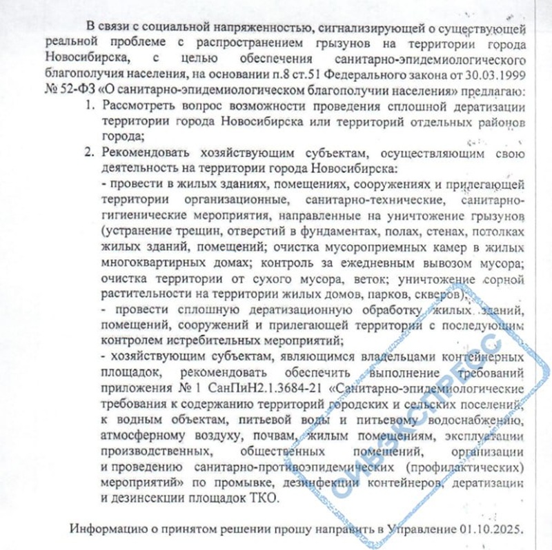 Власти Новосибирска предложили частным структурам провести дератизацию придомовых территорий и площадок с мусорными баками. Но проблема в том, что Роспотребнадзор чётко указывает: эффективность борьбы с грызунами возможна только при одномоментности и полномасштабности работ. Если один двор потравит крыс, а соседний — нет, то животные просто перебегут на несколько метров в сторону. Сплошная дератизация всего города — это огромная задача, которую должна координировать именно муниципальная власть, а не разрозненные частники.