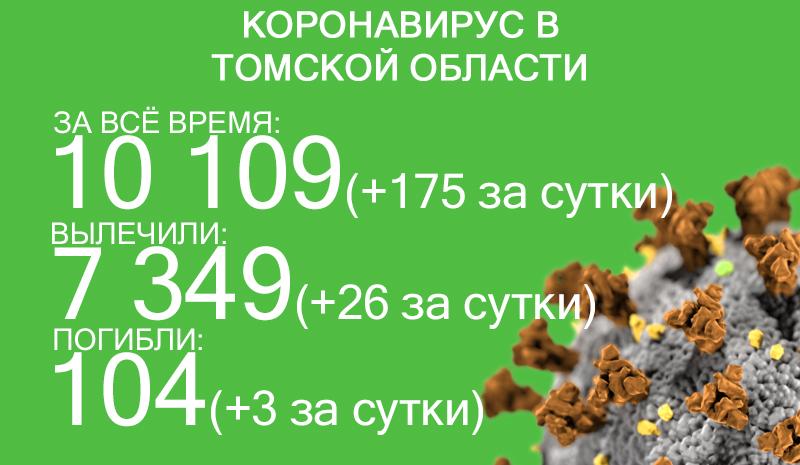 По данным на 19 октября, в Томской области зафиксировали 10 109 случаев заражения коронавирусом. Суточный прирост — 175, у 50 болезнь протекает без симптомов, у 109 — признаки ОРВИ, ещё у 16 — пневмония.