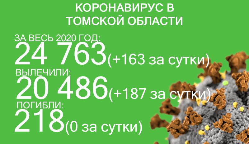 За последние сутки COVID-19 выявили ещё у 163 человек в Томской области, 187 – выздоровели. Об этом 2 января декабря сообщил федеральный оперштаб.