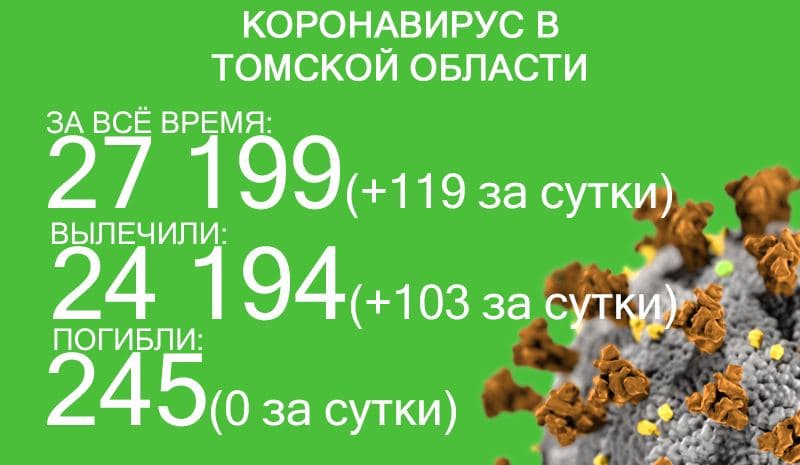 По данным на 21 января, еще 119 человек в Томской области заразились COVID-19. Также за сутки 103 пациента выздоровели. Летальных исходов зарегистрировано не было. Об этом сообщает местный оперштаб по коронавирусу.