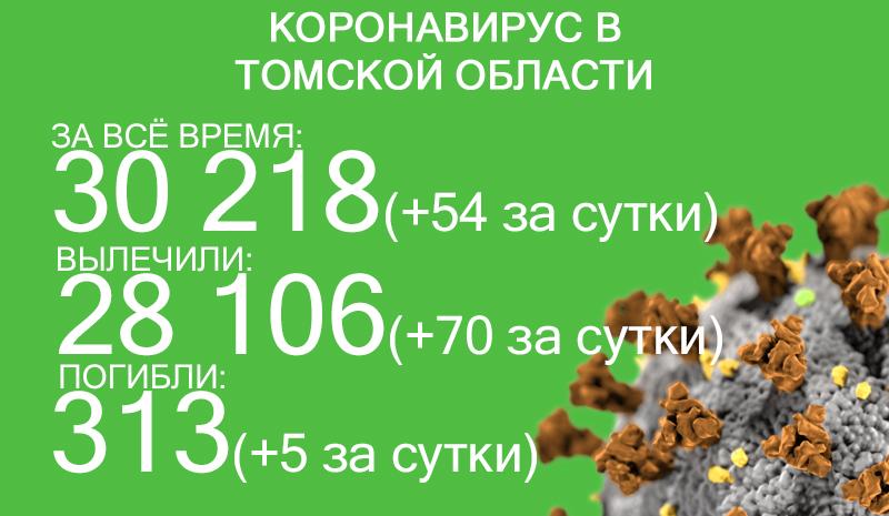 За последние сутки коронавирус выявили ещё у 54 жителей Томской области, общее количество заражений достигло 30 218. Об этом 27 февраля сообщил оперштаб.
