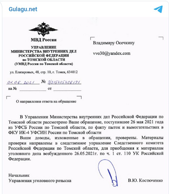 Как следует из ответа УМВД по Томской области, который Управление дало 1 июня на запрос основателя проекта «Гулагу.нет» Владимира Осечкина, уголовное дело возбудили еще 26 мая 2021 года.
