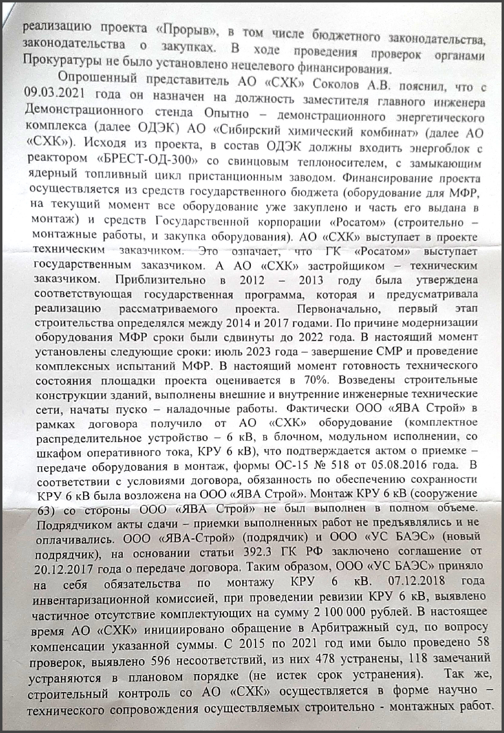 Ответа по существу журналистам пришлось ждать долго, - более двух месяцев. Сначала поступили ответы-отписки из Правительства, Генпрокуратуры, ГК «Росатом», Ростехнадзора, прокуратуры Томской области. Правда, содержательной информации там содержалось крайне немного. По большей части они представляли из себя пересылки запроса друг другу с просьбой провести проверки. Более-менее информативный ответ пришел из УМВД России по ЗАТО г. Северск Томской области только в апреле текущего года, материалы самой проверки датированы 21 марта. В нем нам ответили, что конечно, строительство столь важного объекта, как экспериментальный реактор на быстрых нейтронах со свинцовым теплоносителем «БРЕСТ-ОД-300» находится под жестким контролем ГК «Росатом», Ростехнадзора, АО «СХК», Прокуратуры и иных контролирующих и надзорных органов.