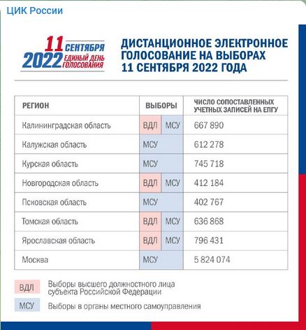 Заявки на право применения ДЭГ на сентябрьских выборах подали семь регионов России: Калининградская, Калужская, Курская, Новгородская, Псковская, Томская и Ярославская области, все они одобрены. На выборах в органы местного самоуправления по предложению территориальных комиссий решение о применении региональной платформы ДЭГ может принять Мосгоризбирком.