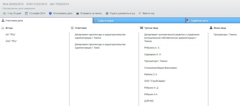 Первый иск АО «ТРЦ» к департаменту архитектуры и градостроительства администрации Томска от 12 ноября 2014 года.
