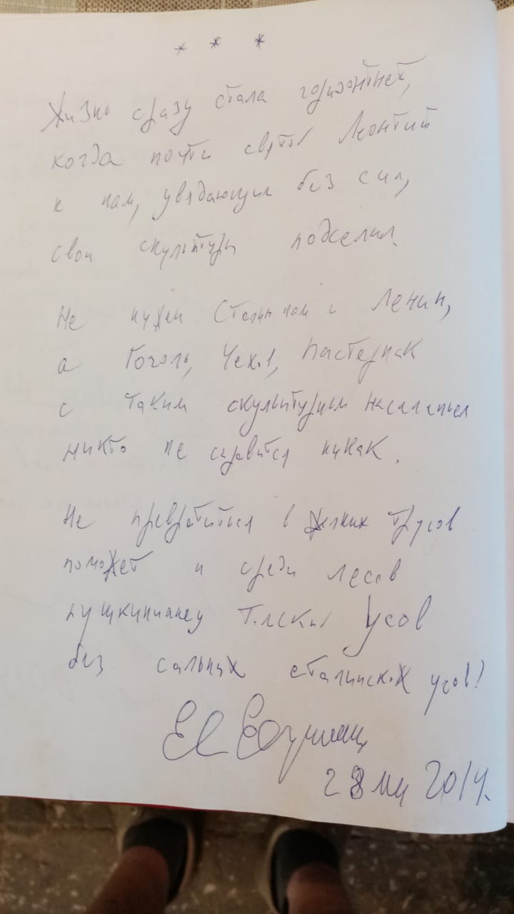 – Да, это было в 2014 году, во время одного из трех посещений поэтом Томска. Когда он зашел в мастерскую, посмотрел мои работы, то искренне обратился к другим гостям со словами: «А вы хоть понимаете, что он — гений?». Сел и на ходу сочинил стихотворение, черновик которого я бережно храню и по сей день.