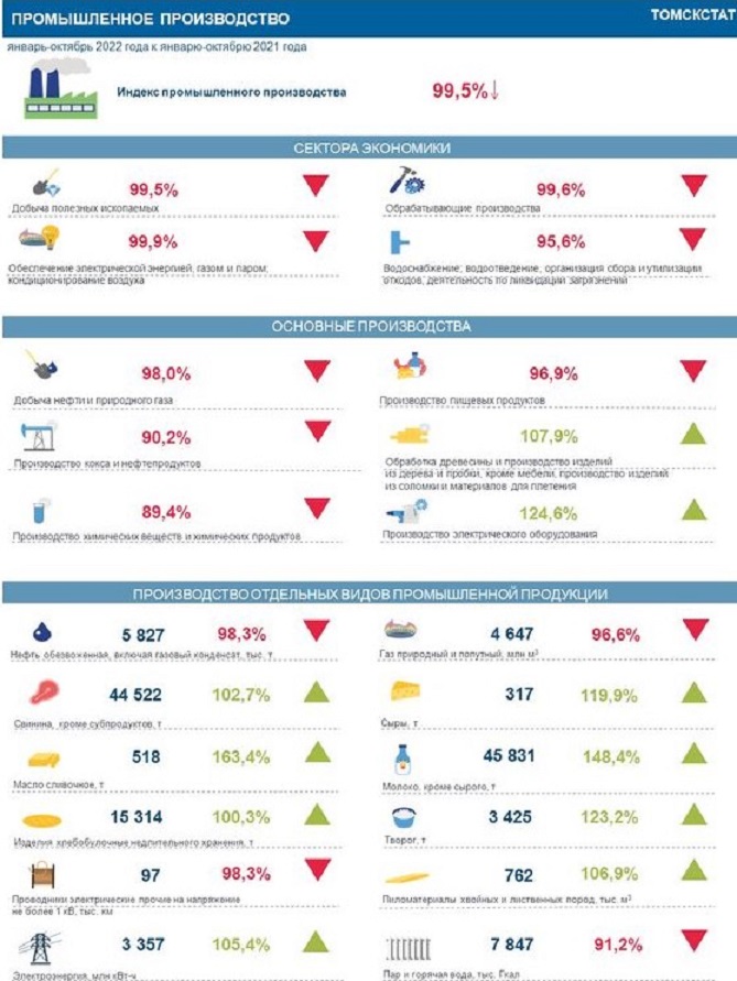 В Томской области промышленное производство за десять месяцев 2022 года по сравнению с аналогичным периодом прошлого года сократилось в среднем на 0,5%. Индекс промышленного производства по отношению к 2021 году составил 99,5%.