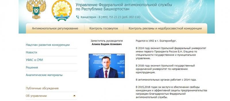 В 1992 году в Екатеринбурге родился господин Алиев. Всего в 23 года он начал работать в антимонопольных ведомствах Свердловской области и республики Башкортостан. Это практически сразу после того, как в Уральском Федеральном Университете имени первого Президента России Б.Н. Ельцина (УрФУ) ему «оформили» диплом в 2014 году. Почему именно «оформили» — объясним чуть позже.