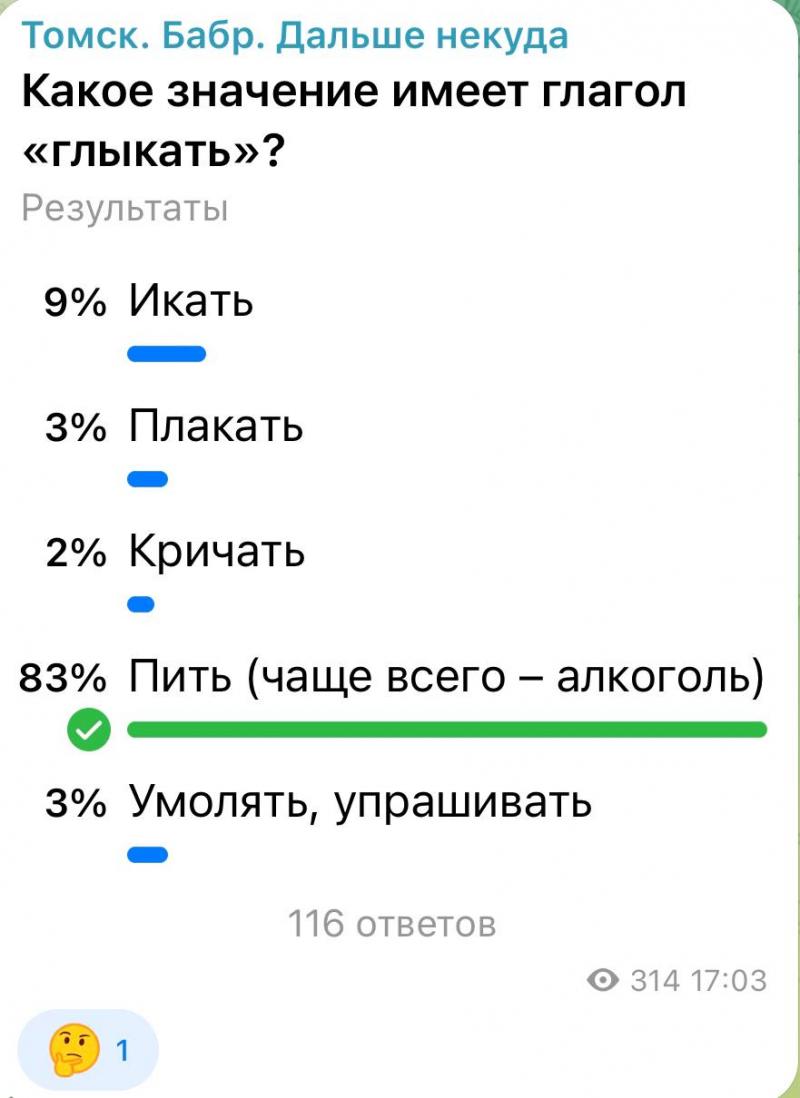 10 августа 2024 года подписчики ТГ-канала «Томск. Дальше некуда» устанавливали значение глагола «глыкать». Варианты ответов: икать; плакать; кричать; пить (чаще всего – алкоголь); умолять, упрашивать. Приняли участие 116 человек, публикацию просмотрели 314 человек. 83% реципиентов выиграли в викторине.