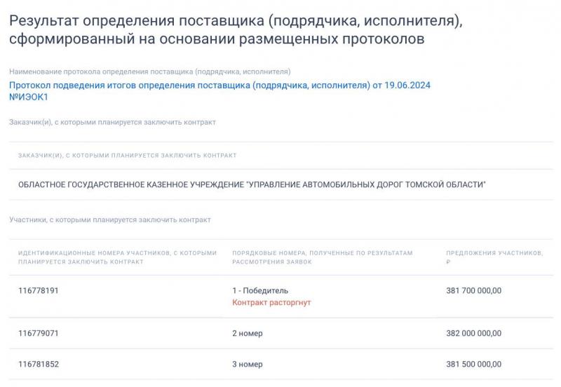 Действительно, на сайте zakupki.gov.ru мы обнаружили лот «Выполнение работ по ремонту мостового перехода через р. Кия на км 46+000 автомобильной дороги Больше-Дорохово – Тегульдет в Зырянском районе Томской области», размещённый 13 мая 2024 года. Дата окончания подачи заявок – 14 июня 2024 года. Начальная цена – 382 160 824 рубля. Именно из-за этого контракта, а точнее – из-за его расторжения, ООО «ТСК» и внесли в реестр недобросовестных поставщиков.