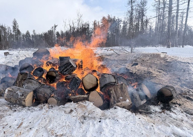 В Лучаново-Ипатовском кедровнике зимой 2026-го снова сжигают древесину, пораженную союзным короедом. Работы проводятся силами «Томсклеса».